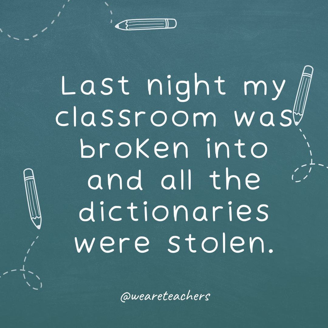 9. Final night time, my classroom was damaged into and all of the dictionaries have been stolen.