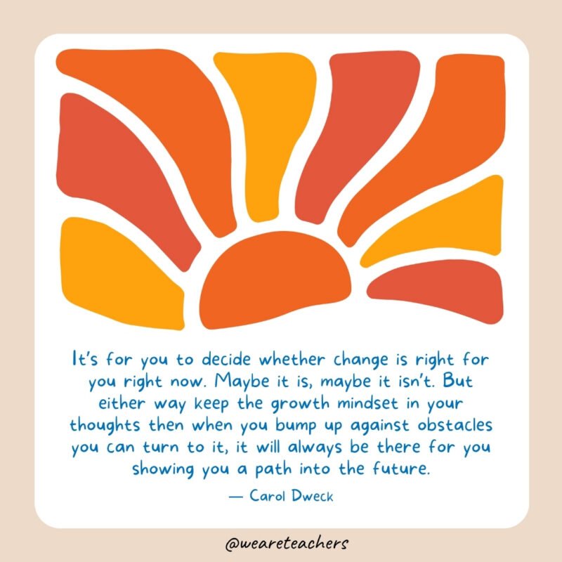 40. “It’s so that you can determine whether or not change is best for you proper now. Possibly it’s, possibly it isn’t. However both approach hold the expansion mindset in your ideas then if you bump up in opposition to obstacles you may flip to it, it would at all times be there for you displaying you a path into the long run.” — Carol Dweck
