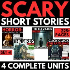 This bundle comprises three scary quick tales, together with “The Birds” by Daphne DuMaurier, “The Elevator” by William Sleator, and “Click on Clack the Rattle Bag” by Neil Gaiman. Every is a Halloween studying comprehension unit with questions, annotation actions, graphic organizers, reply keys, and extra.