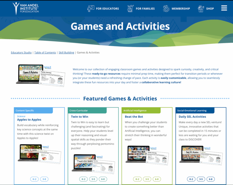 It was very simple to implement. I particularly used it for morning assembly. I wanted the actions to be fast and have restricted materials necessities. The Video games and Actions tab was the right place to look as a result of all the slides and hyperlinks are laid out for you. I used to be in a position to sift by the actions rapidly and discover what I used to be in search of by filtering by the grade band stage. This can be a very low-prep, high-reward kind of useful resource as a result of it saves educators time however makes a large distinction.