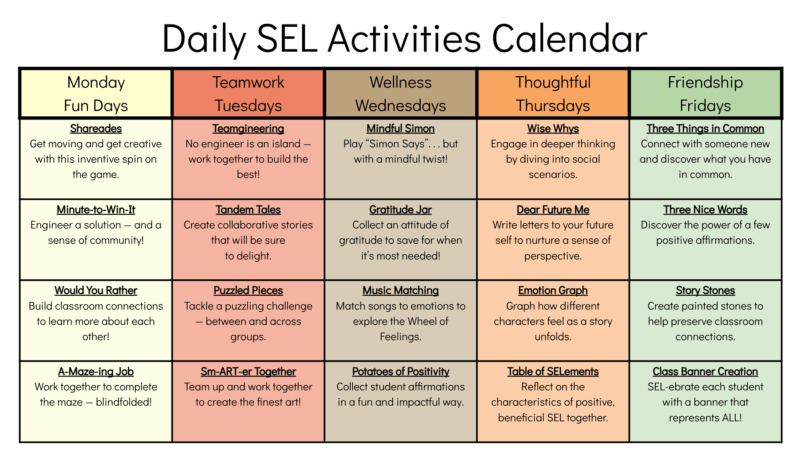 1. Day by day SEL Actions Calendar: I’ve used the Day by day SEL Actions Calendar quite a bit as a result of it offers thorough and significant classes in a manner I hadn’t thought of for my morning assembly. It’s a fast and simple option to keep deliberate and prepared daily of the week.