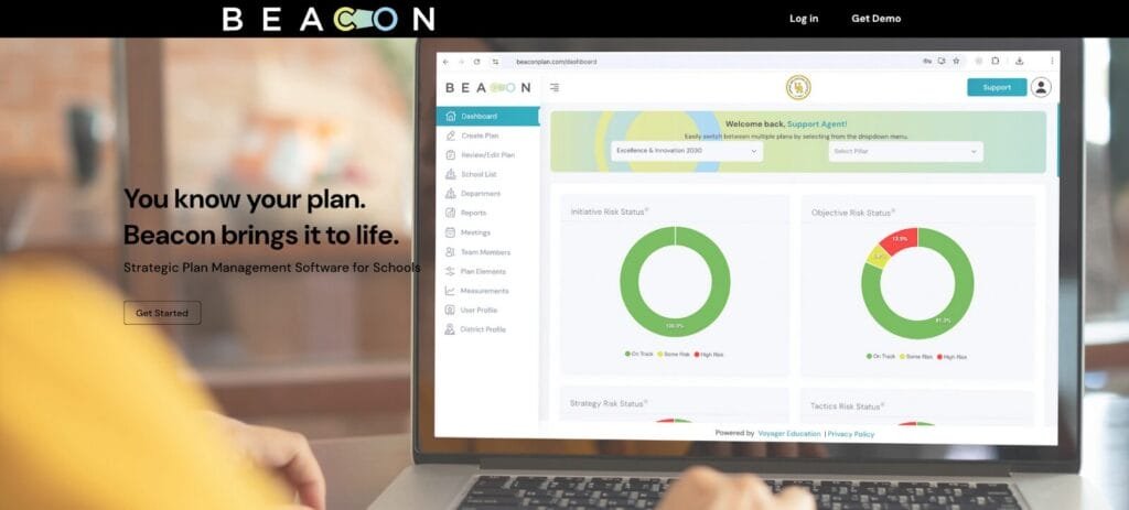 Beacon is among the many greatest strategic planning and execution instruments for Ok-12 college districts. Directors use it to create and construct plans that span a number of faculties. Actual-time progress monitoring is feasible with standing updates offered by all concerned events. Faculties can work on particular person targets and measure their influence with customizable experiences drawn from user-friendly dashboards.