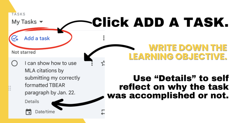 2. Creating duties: College students log into their Google Calendar, create a job, and set it as the training goal for the day or unit, utilizing student-friendly language and a transparent deadline. (See the photographs Miss Saylor created for us beneath!)