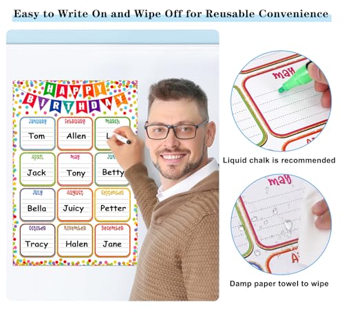 【Reusable & Durable】: Birthday poster is made of high quality cardstock paper and the surfaces are coated with laminated PET film layer which are durable,easy to write student’s name with liquid chalk and erased after writing,allowing for repeated use year after year, making it an economical and eco-friendly choice for classrooms.