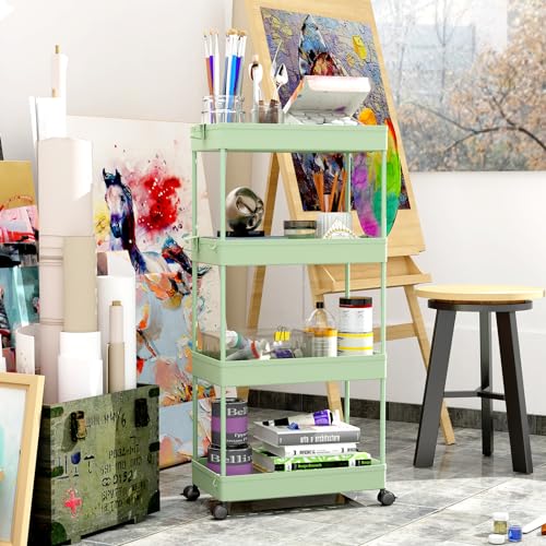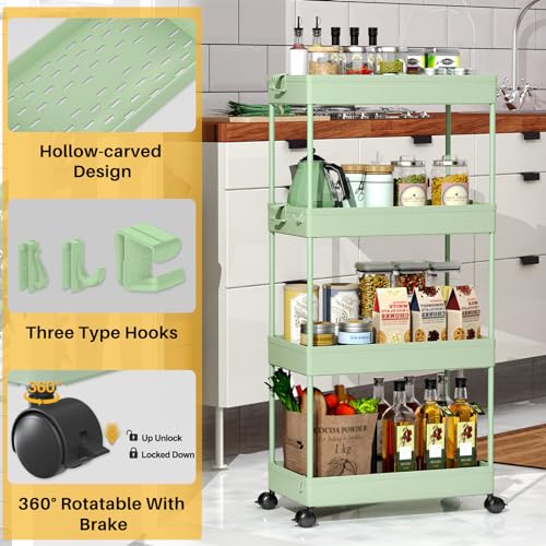 SPACEKEEPER Storage Cart 4-Tier, Bathroom Rolling Cart Utility Storage Organizer Shelf Mobile Shelving Unit for Kitchen Living Room Bathroom Laundry Room & Dressers, Green